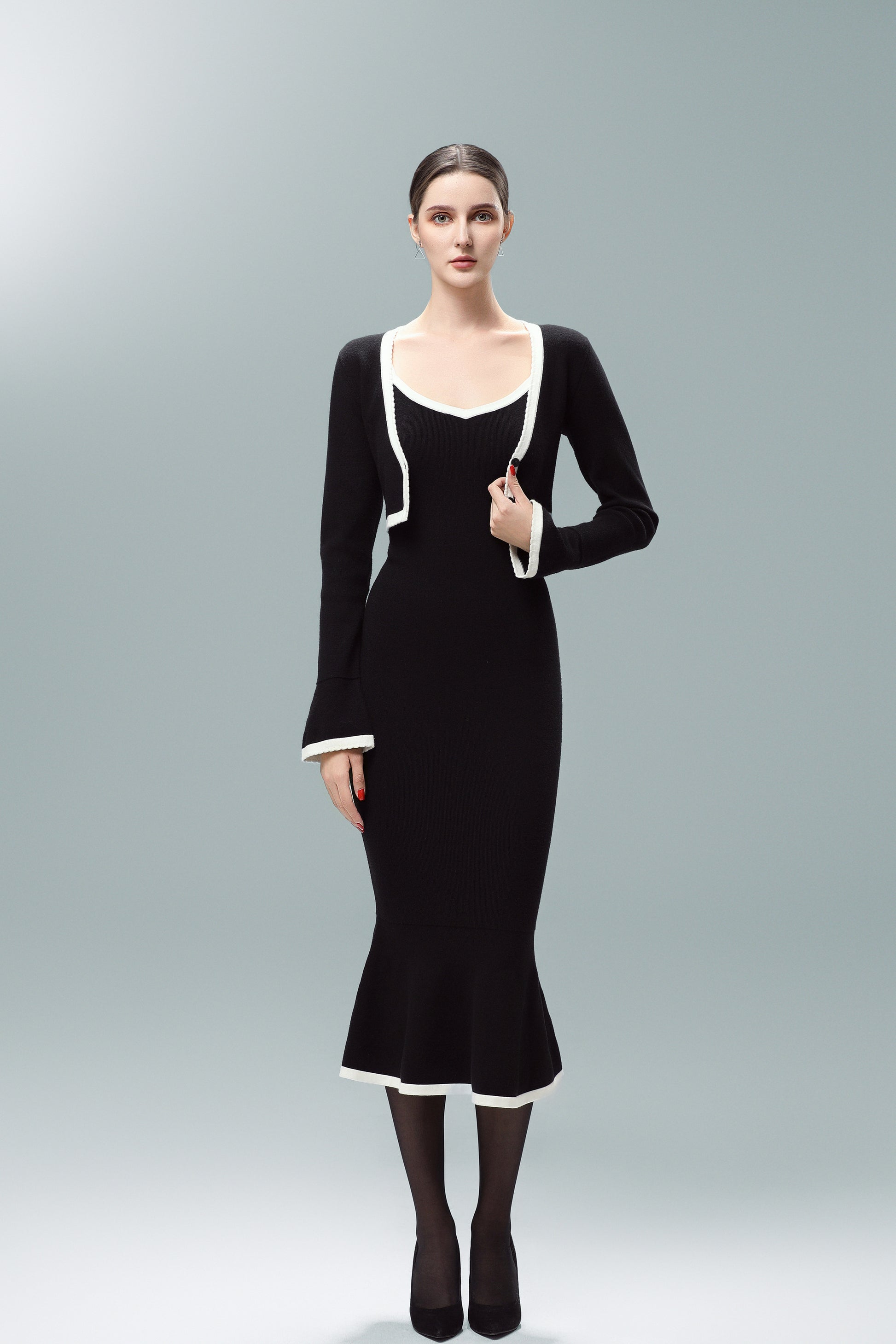The Eli cropped jacket is the perfect blend of elegance and versatility. Crafted from 100% premium knit, it offers the same soft, stretchy, and breathable feel as the Eliana dress, making it a seamless match. The waist-defining cut enhances your silhouette, while the structured yet flexible design ensures comfort and ease of movement. The black and white contrast detailing adds a refined touch, making this jacket a timeless wardrobe staple.
