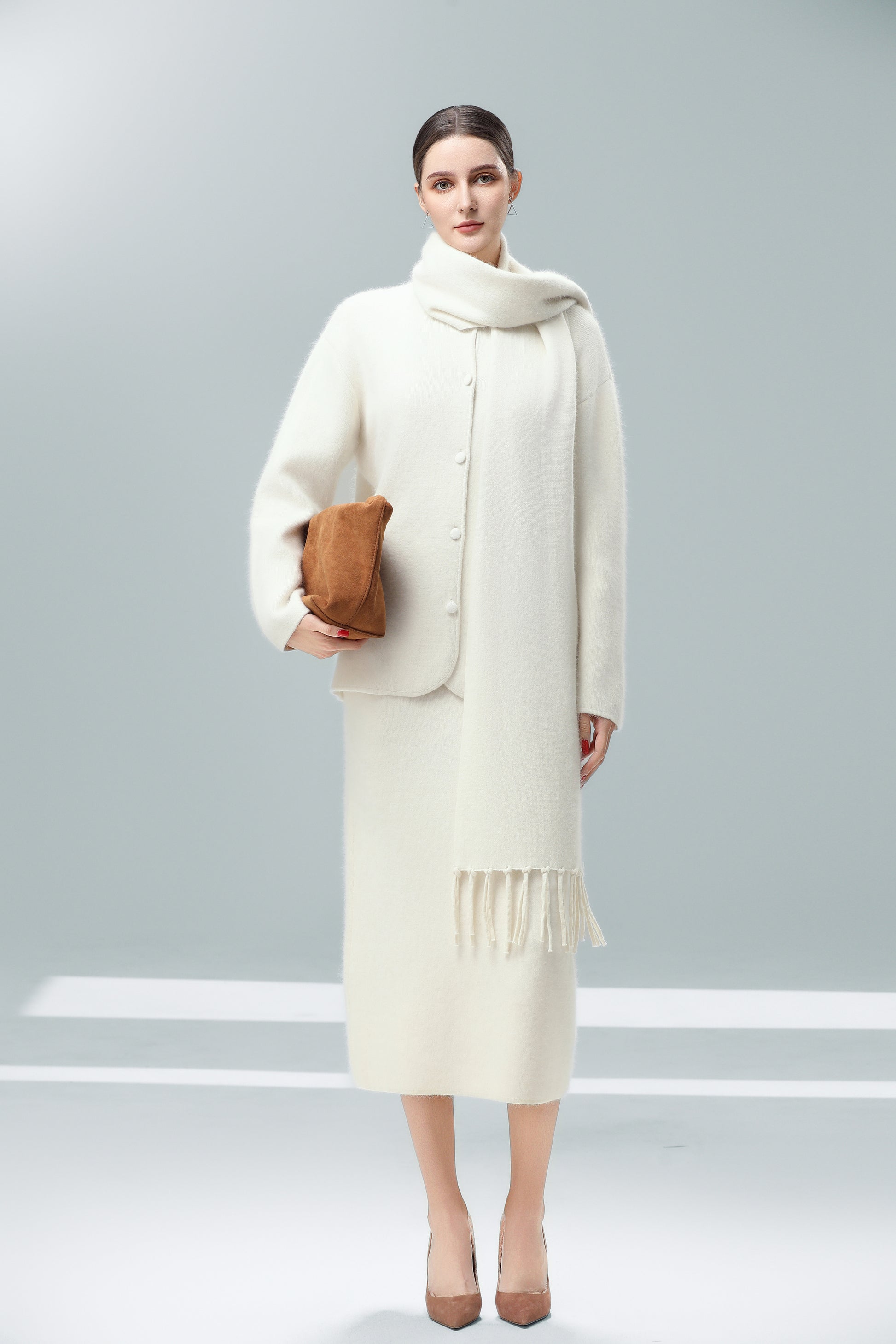 This extra-long, white, cozy, and luxurious scarf is designed to complement the Hera skirt and Magda jacket, creating a refined and elegant look. Made from the same high-quality wool blend, it offers warmth, softness, and a plush feel, perfect for colder days. The extended length allows for versatile styling—wrap it multiple times for a snug, layered effect or drape it loosely for an effortlessly chic touch.